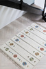 Handvävd röllakanmatta i ull. Mattan har ljust naturvit botten med ett stiliserat blomstermotiv längs med kanterna samt ett randigt mönster som löper tvärs över hela mattan. Blomstermotivet går i grönt, blått, gult och rött.